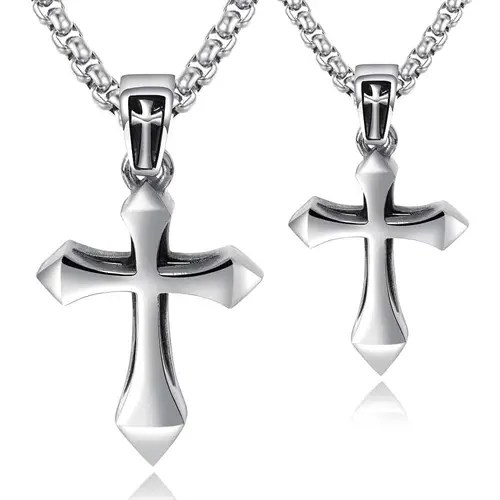 2 kors i rustfri ædelstål som parsmykker.Korset til hende måler 2×3 cm og til ham 2,5×3,5 cmDer medfølger 2 kæder i rustfri stål på 55cm og 3mm tyk.Prisen er for begge smykker.