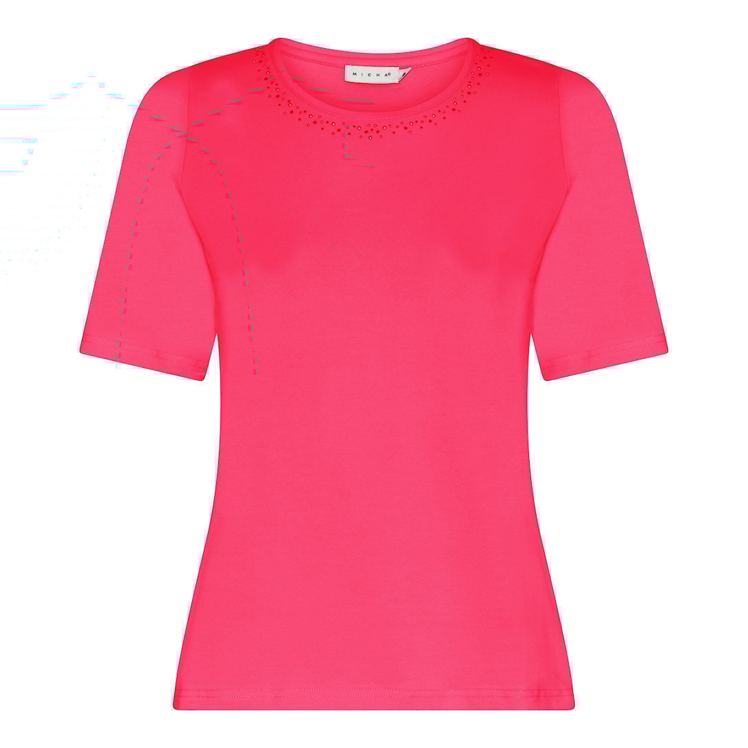 Denne klassiske T-shirt fra MICHA er en uundværlig del af enhver garderobe. Den smukke pink farve tilføjer femininitet til det enkle design. T-shirten bevarer sin form vask efter vask og føles fantastisk mod huden hele dagen. Materialet består af 45%Modal