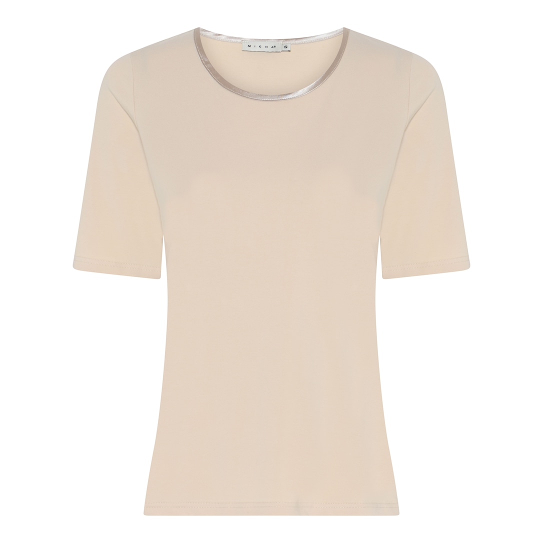 Denne klassiske T-shirt fra MICHA er en uundværlig del af enhver garderobe. Den smukke vaniljehvid farve tilføjer femininitet til det enkle design. T-shirten bevarer sin form vask efter vask og føles fantastisk mod huden hele dagen. Materialet består af 4