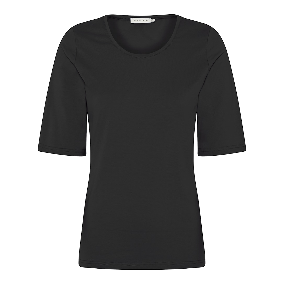 Denne klassiske T-shirt fra MICHA er en uundværlig del af enhver garderobe. Den smukke sort farve tilføjer femininitet til det enkle design. T-shirten bevarer sin form vask efter vask og føles fantastisk mod huden hele dagen. Materialet består af 95%Cotto