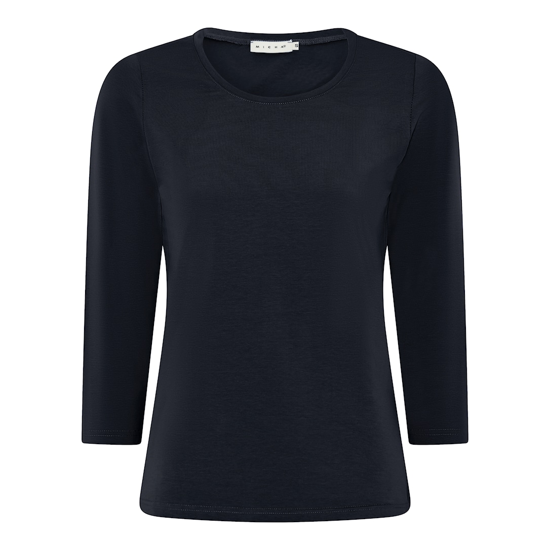 Denne alsidige top fra MICHA i navy er din go-to for ubesværet stil hver dag. Den komfortable pasform og høje kvalitet sikrer, at den holder form og farve vask efter vask. Materialet består af 95%Cotton/5%Elastane, hvilket giver en behagelig følelse mod h